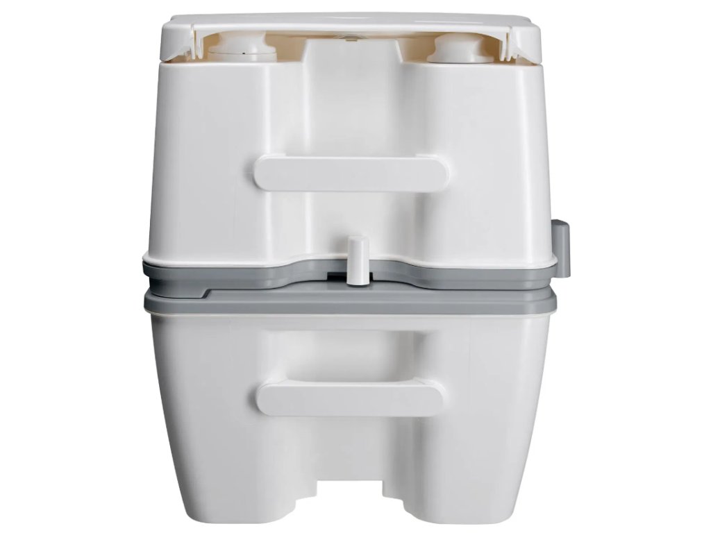 WC Thetford Porta Potti 565E se skládá ze dvou částí: horní kazety, která obsahuje mísu a nádržku na splachovací vodu, a spodní kazety, která slouží jako fekální nádrž. Tento design je nejen praktický, ale i hygienický, protože obě části lze snadno oddělit pro čištění a údržbu.