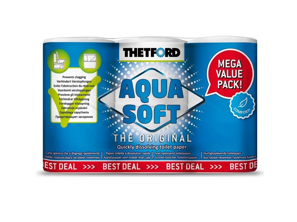 Thetford Aqua Soft je speciálně vyvinutý rozkladový toaletní papír, určený pro chemická WC, mobilní toalety, karavany, obytné vozy, lodě i kempingové použití. Nabízí ideální rovnováhu mezi vysokým komfortem při používání a maximální šetrností k odpadnímu systému, což z něj činí nepostradatelný doplněk každého cestovatele. Papír je dvouvrstvý, měkký a zároveň dostatečně pevný, aby poskytoval pohodlí srovnatelné s domácím toaletním papírem. Přesto je navržen tak, aby se rychle a efektivně rozkládal ve vodě, což je zásadní pro správnou funkci chemických toalet.