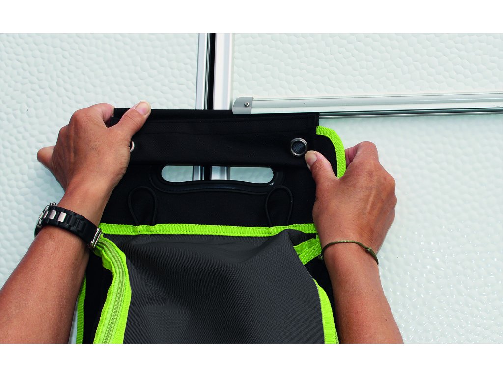 Organizér je vybaven praktickým madlem, které umožňuje pohodlné přenášení a manipulaci. Snadno jej přesunete z karavanu, stanu nebo skříně kamkoli potřebujete.