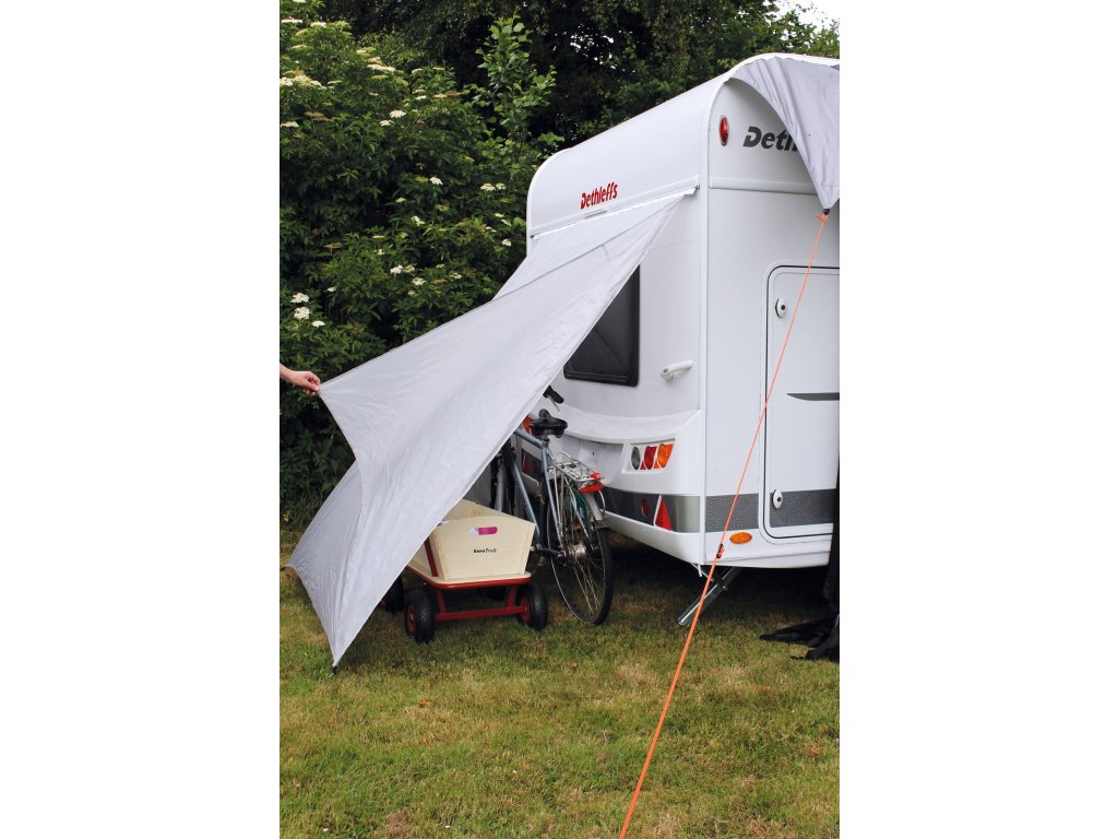 Půdorys 150 × 190 cm poskytuje dostatek prostoru nejen pro jízdní kola, ale také pro skládací židle, stoly nebo jiné kempingové příslušenství. Přístřešek tak slouží jako víceúčelová ochrana zadní části karavanu a pomáhá udržet okolí obytného vozu přehledné a organizované.