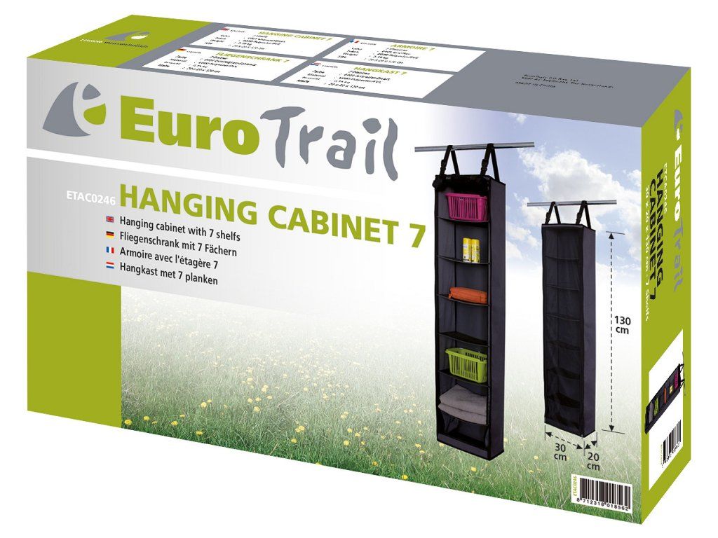 EUROTRAIL Skříňka na pověšení se 7 přihrádkami je praktickým a spolehlivým organizérem pro každého, kdo chce mít své věci perfektně uspořádané doma i na cestách. Poskytuje přehledné uložení, flexibilní zavěšení, vyztužené police a odolný materiál pro dlouhodobé používání.