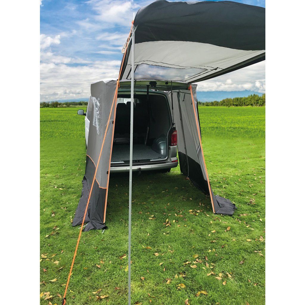Stan jednoduše přehodíte přes otevřené páté dveře a během několika minut získáte krytý prostor navíc. Ten využijete jako kuchyňku, úložný prostor nebo místo na převlékání. Bez složité stavby tak výrazně zvýšíte komfort při cestování. Ideální při krátkých zastávkách i delším kempování.