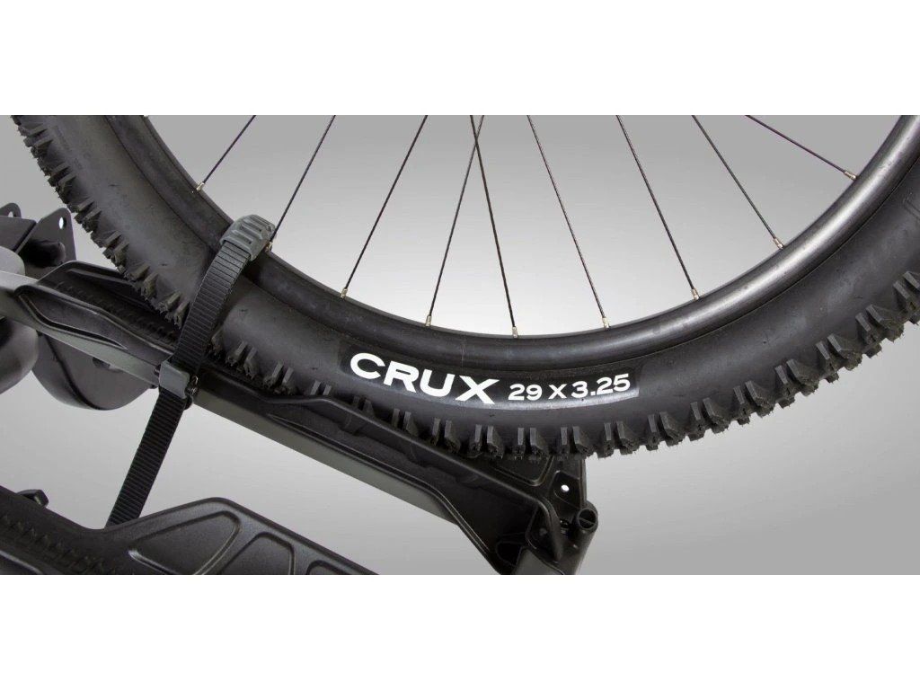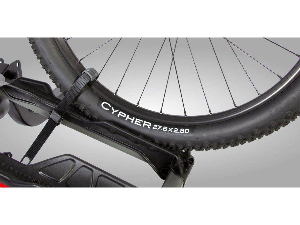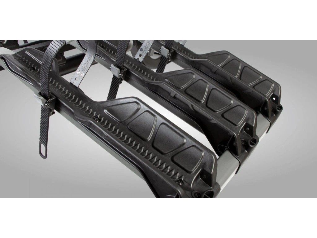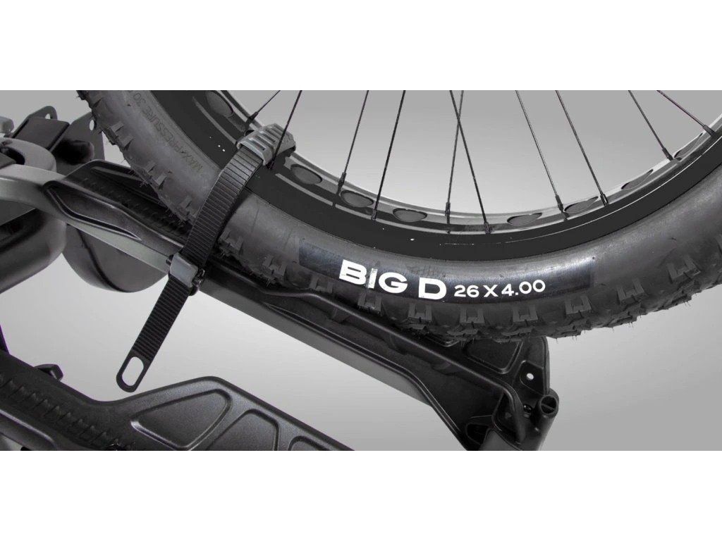 Dlouhé pogumované popruhy kol drží pneumatiky široké až 4”, potáhnutím je utáhněte a pomocí rychloupínače uvolněte. Rozteč mezi jednotlivými držáky (kolejnicemi) je 20 cm (měřeno od středu žlábku).