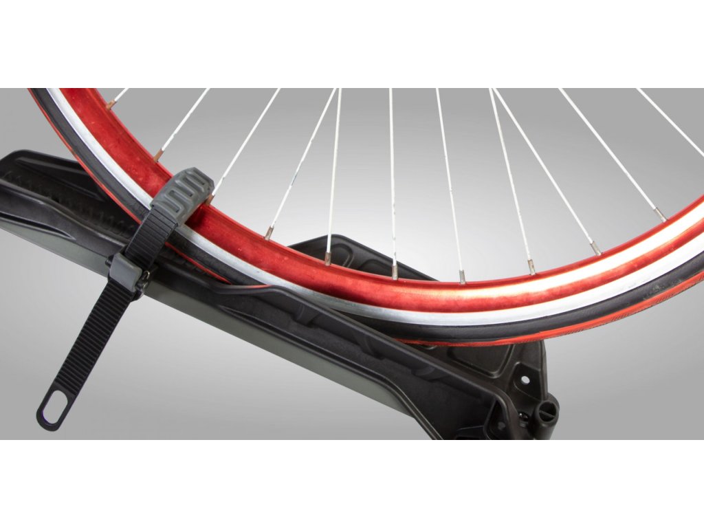 Držáky kol jsou vybaveny upínacími popruhy. Dvojbodovým pro přední kolo a jednobodovým pro zadní kolo. Popruhy jsou dostatečně dlouhé, aby bezpečně obepnuly i široká kola. Držáky kol pojmou jakýkoliv typ pneumatik a navíc vypadají dobře!