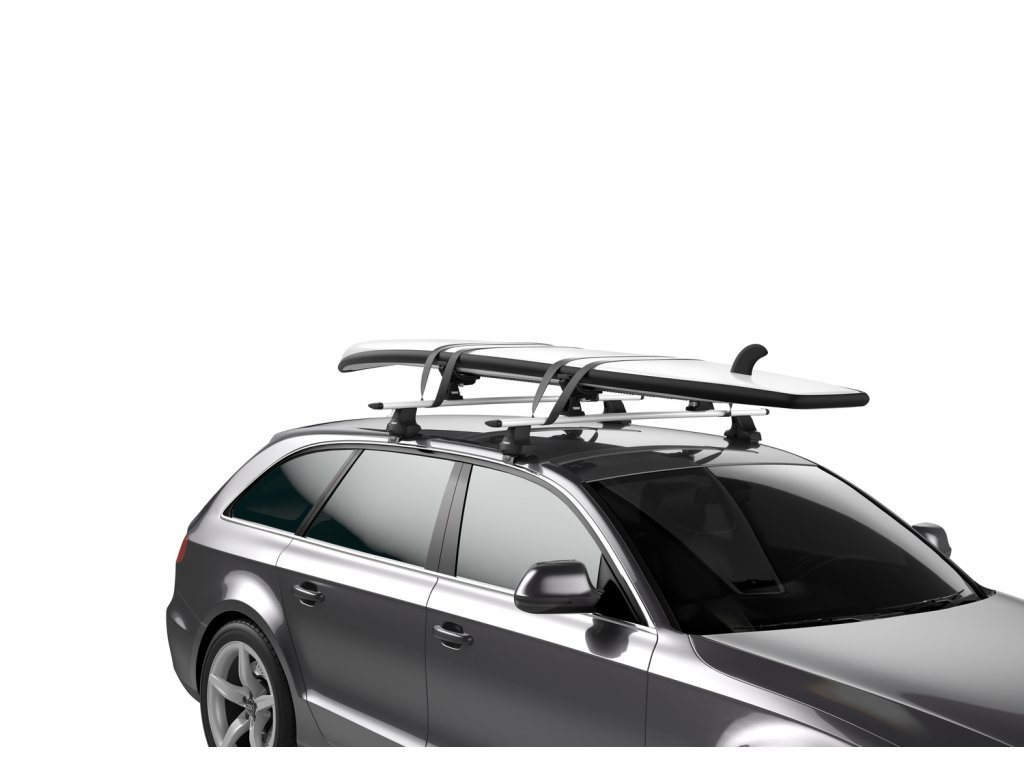 Díky dvěma nezávisle otočným podpěrám s pákou nastavení úhlu dokáže převážet různé tvary paddleboardů.