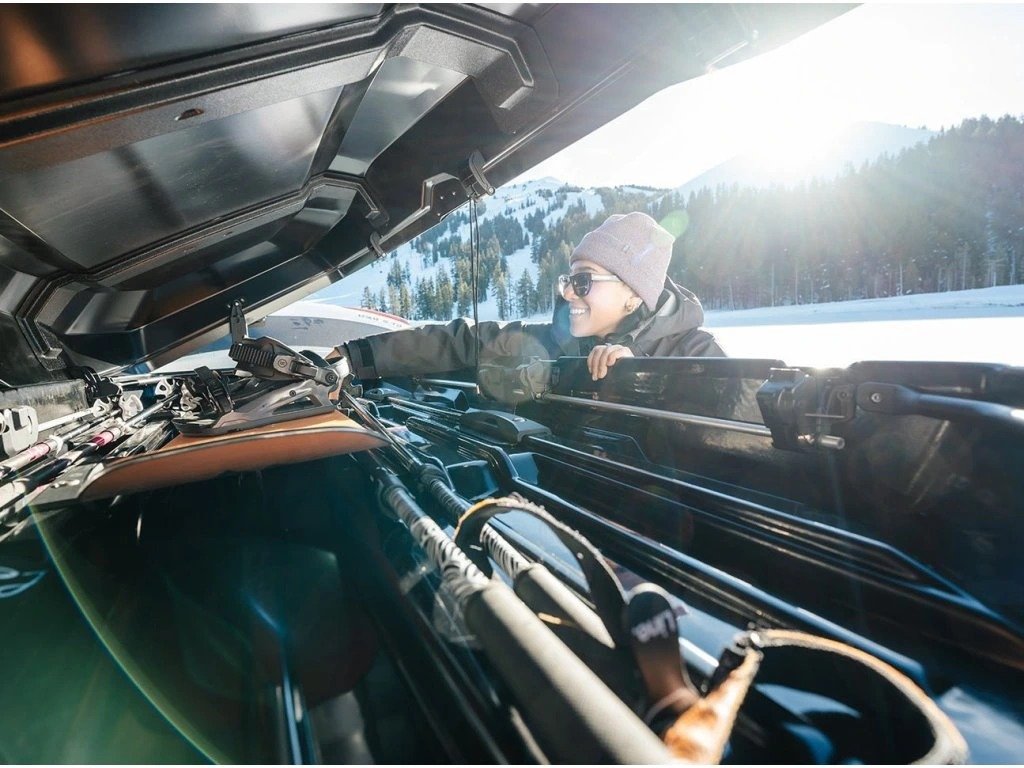 Střešní box je oboustranně otevíratelný. Otevírací rukojeť umožňuje komfortní otevírání a zavírání, a zároveň uzamkne výbavu uvnitř boxu a box k vozidlu.