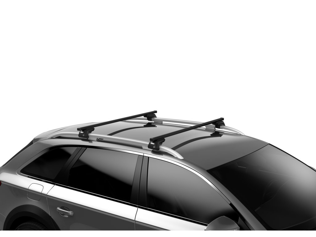 Kompletní střešní nosiče Thule SquareBar s rychlou a snadnou montáží, určené pro vozy se zvýšenými střešními podélníky. Balení obsahuje 4 patky a 2 tyče SquareBar.